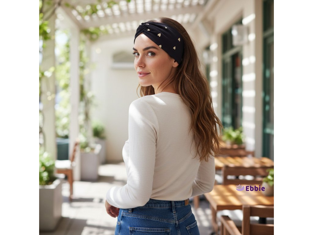 Bavlněná čelenka - ZLATÁ SRDÍČKA NA ČERNÉ