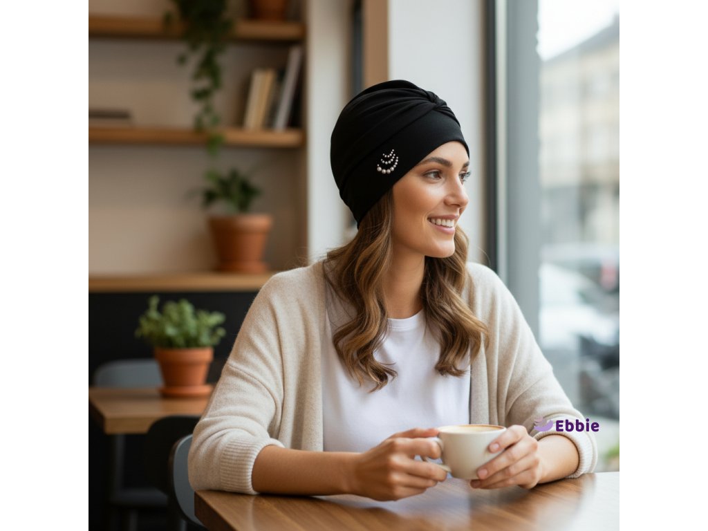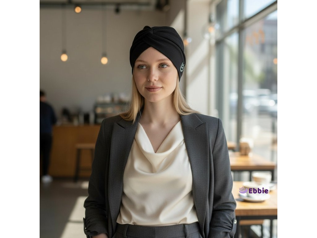 💎 Na turban je aplikováno logo Ebbie z originálních kamínků Preciosa, které dodávají luxusní vzhled.