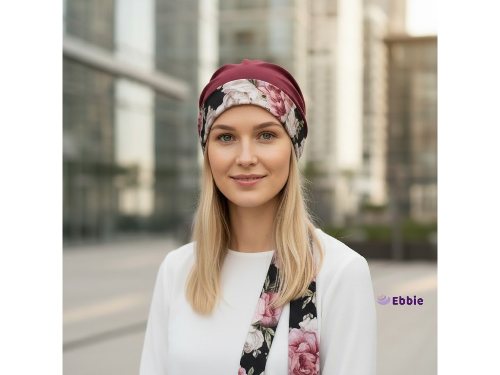 Bavlněný turban-lux - BORDÓ - PIVOŇKY NA ČERNÉ