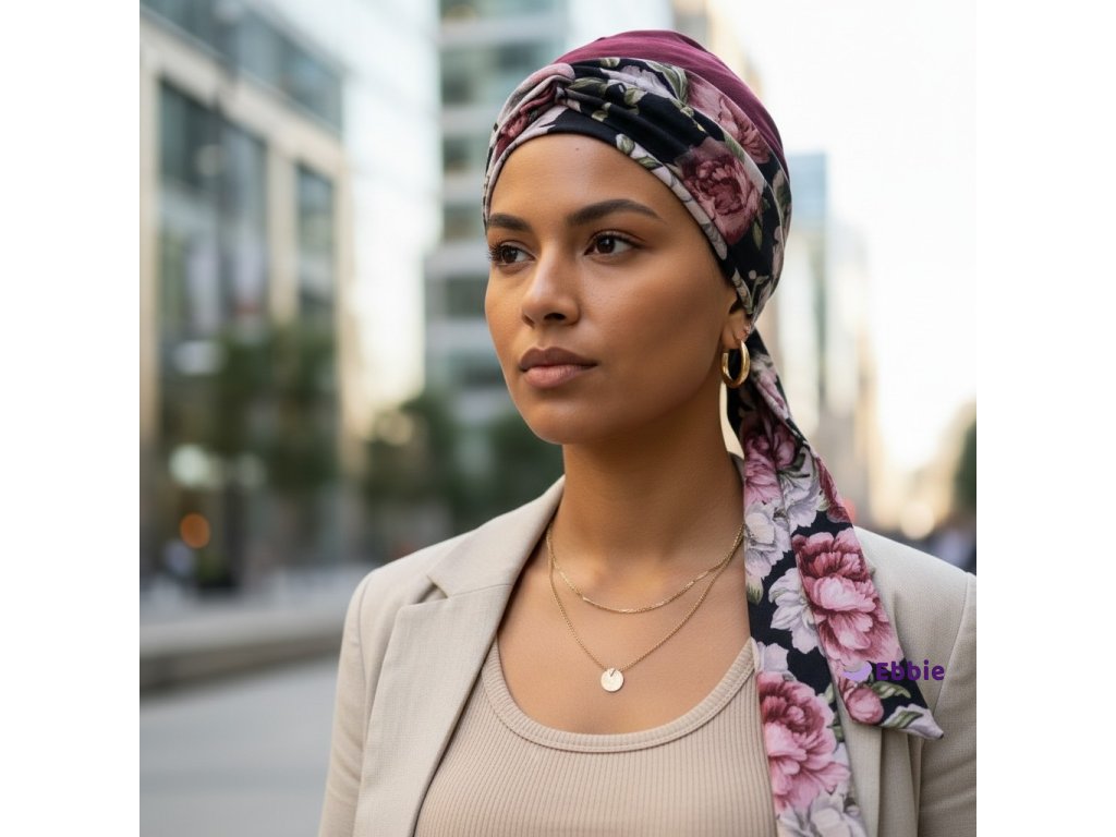 Součástí je vázání, které je dostatečně dlouhé – umožňuje vytvořit smyčku vpředu, nebo zvolit hladký, minimalistický styl. Vzorovaná látka tvoří všitý lem s vázáním, který dodává turbanu charakter a variabilitu nošení.