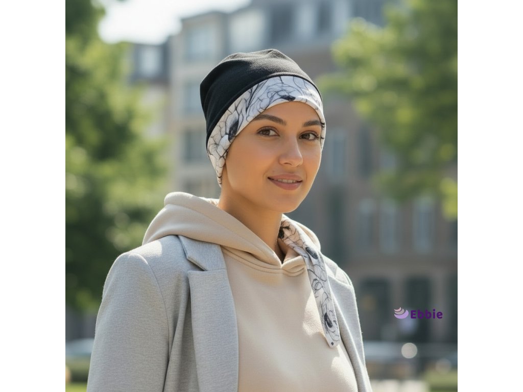 Součástí je vázání, které je dostatečně dlouhé – umožňuje vytvořit smyčku vpředu, nebo zvolit hladký, minimalistický styl. Vzorovaná látka tvoří všitý lem s vázáním, který dodává turbanu charakter a variabilitu nošení.