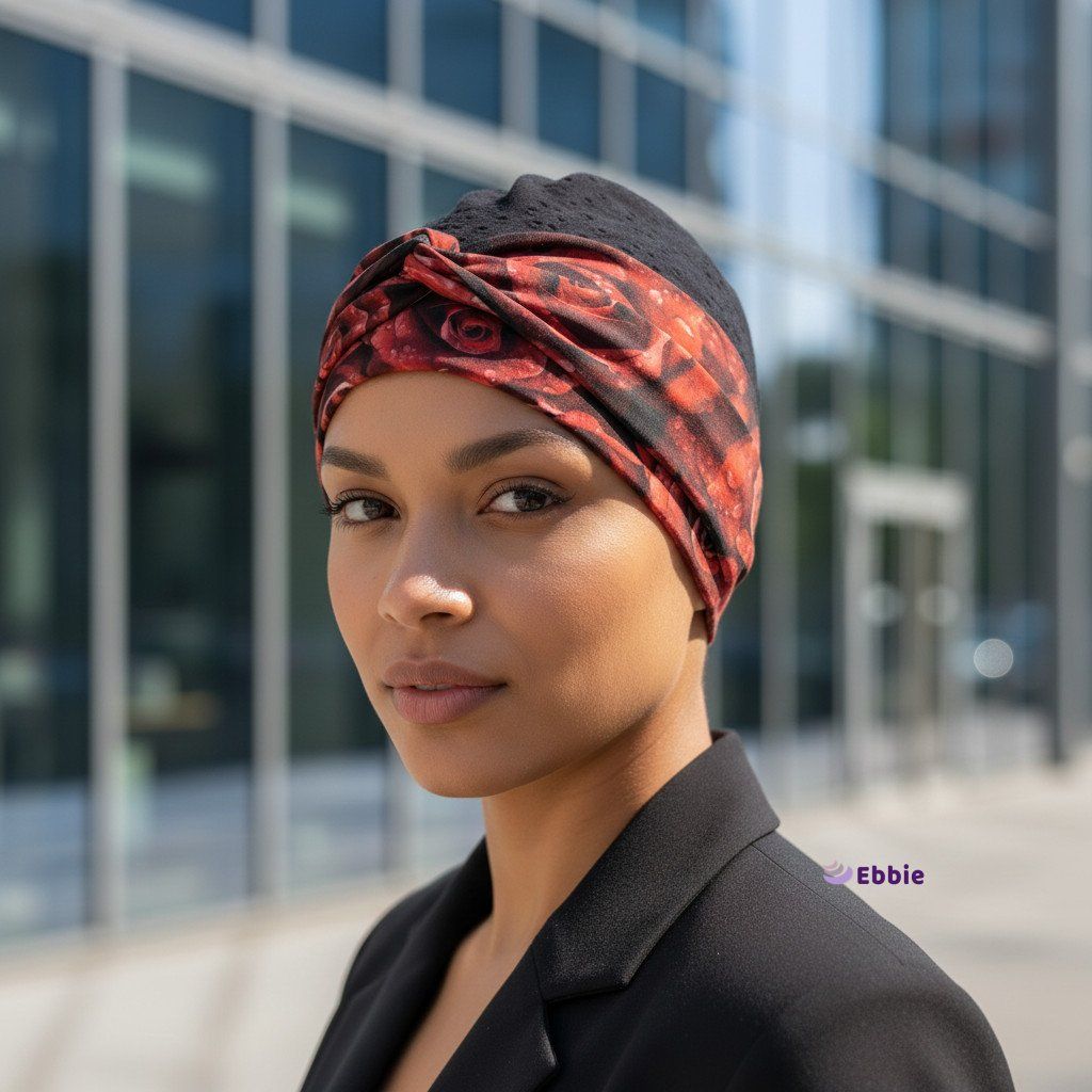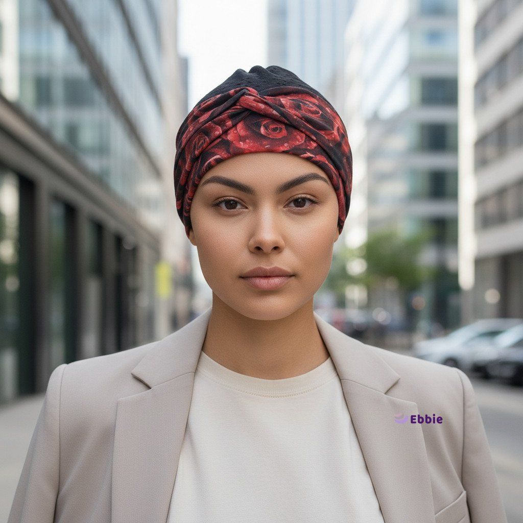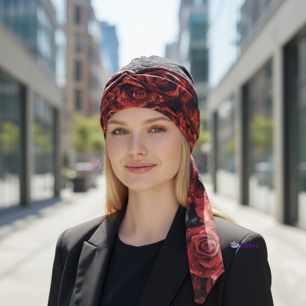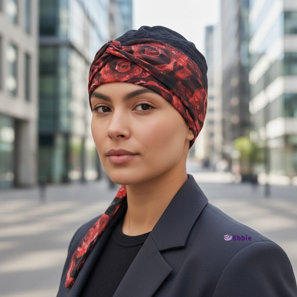 Turban-lux - ČERNÝ - ČERVENÉ RŮŽE NA ČERNÉ