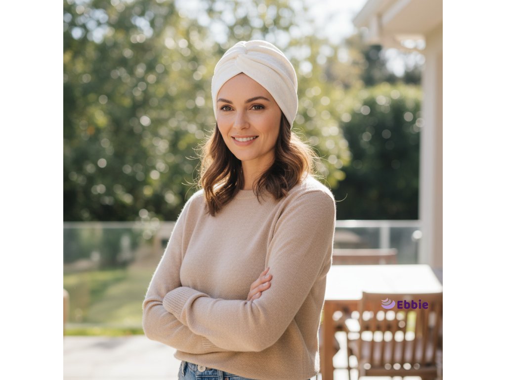 Tento lehký a prodyšný turban je ideální volbou pro ženy po chemoterapii – poskytuje jemnou ochranu citlivé pokožky hlavy a zároveň zajišťuje maximální pohodlí. Díky jemné perforaci působí elegantně a vzdušně.